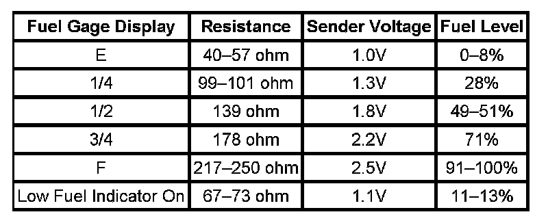The information in this table is intended for use with the J 33431-C Signal Generator and Instrument Panel Tester. The fuel level sensor values represent the test values to be used on the Signal Generator to drive the fuel gage display to the indicated positions. Vehicles that require more than one fuel level sensor calculate gage position from many possible resistance combinations of fuel levels between the two tanks. Therefore, the values in the table may not correlate directly to readings taken from the vehicle primary or secondary sending units.