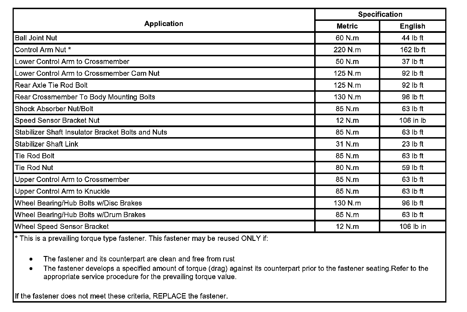 Fastener Tightening Specifications: