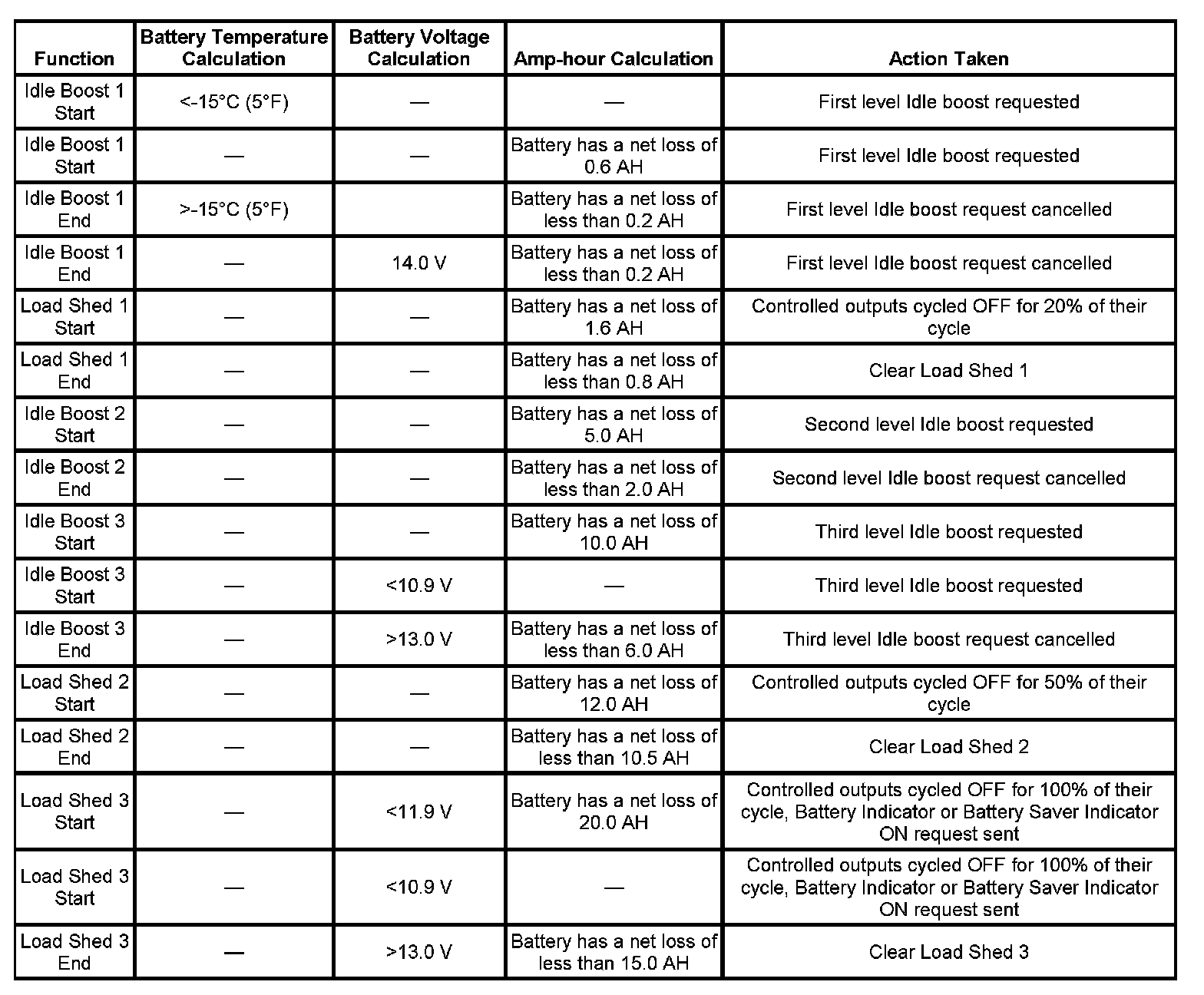 During each load management function, the BCM checks the battery temperature, battery voltage and amp-hour calculations and determines if a different power management function should be implemented.