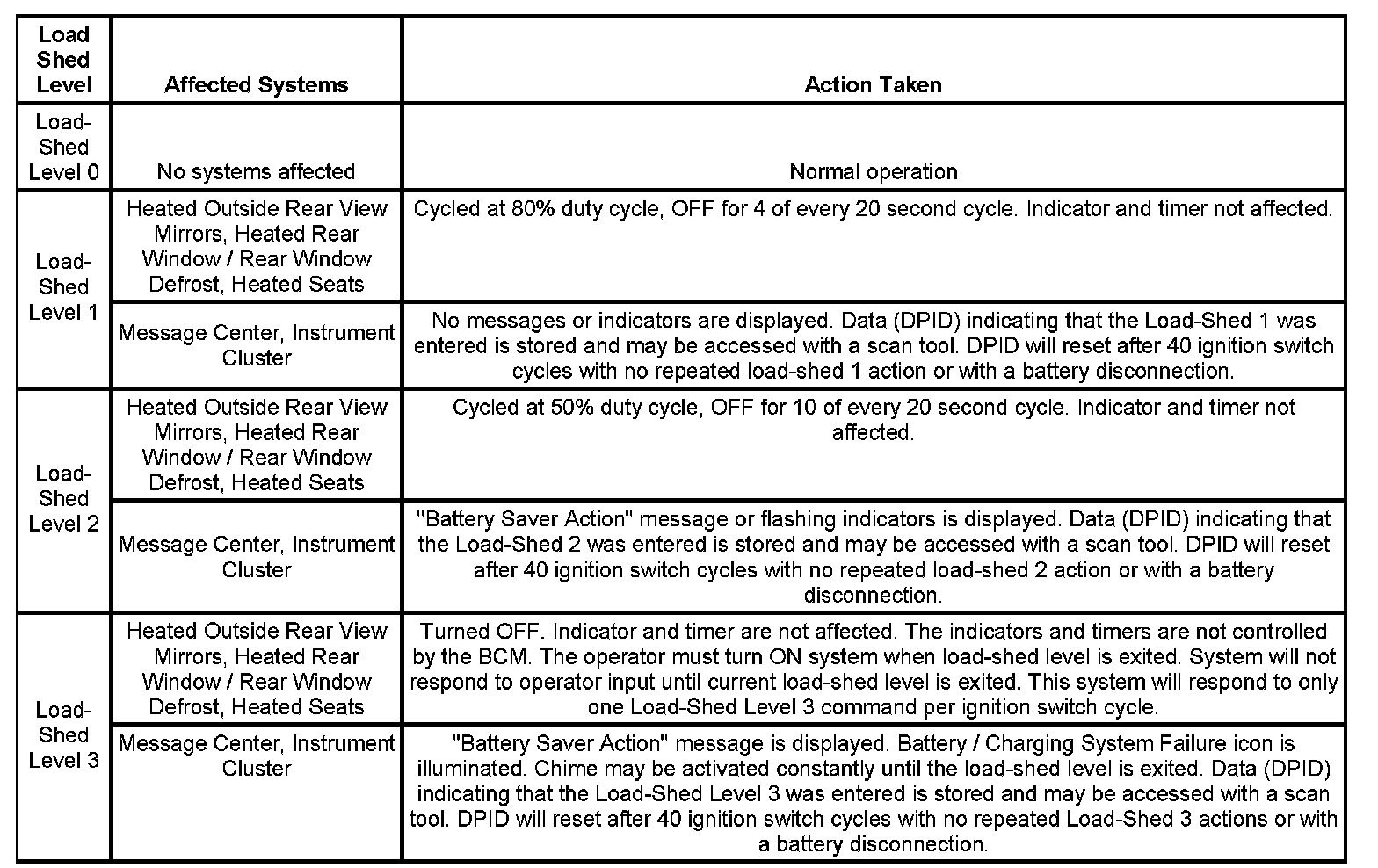 The BCM will turn off loads, called the load-shed function, in order to preserve the vehicle electrical system operation. The criteria used by the PMM to regulate this electrical load management are outlined.