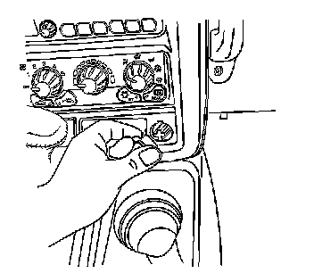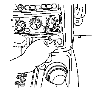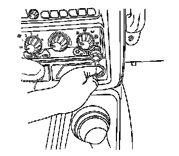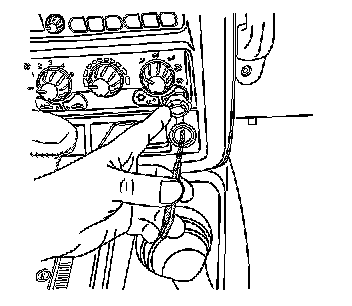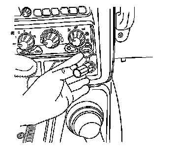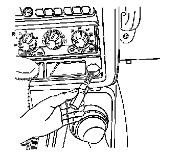 2. Remove the 12-volt power supply receptacle by placing one side of the "T" portion of J 42059 into the tab window. Angle the other side into the opposite tab window. Pull the 12-volt power supply receptacle straight out.