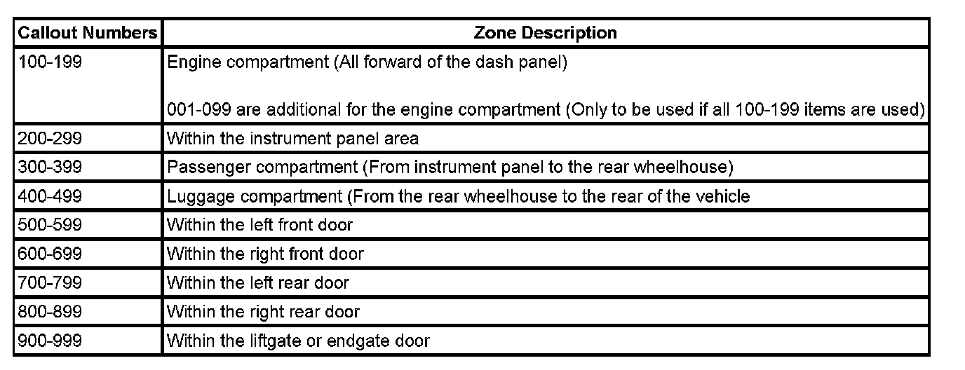 All grounds, in-line connectors, pass-through grommets, and splices have identifying numbers that correspond to where they are located in the vehicle. The following table explains the numbering system.