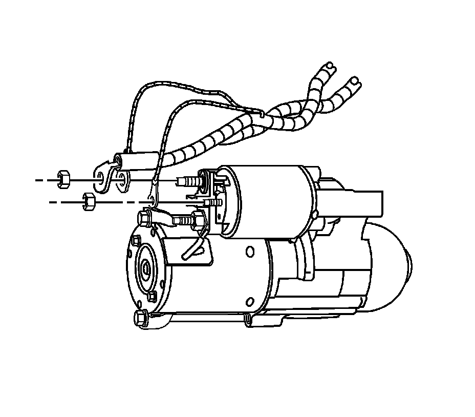 6. Install the starter motor solenoid positive terminal electrical wires and nut.