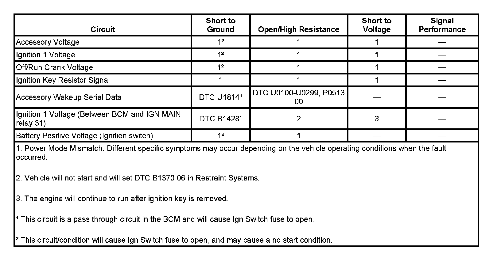 Some system functions may operate one time and not the next with a specific fault in the ignition switch circuits depending on the vehicle operating conditions when the fault occurred. Some examples are as follows: