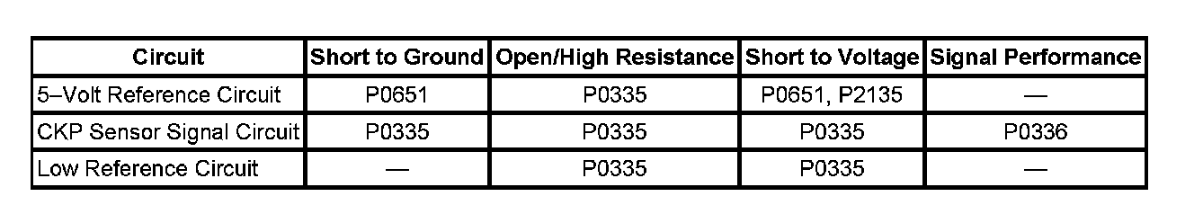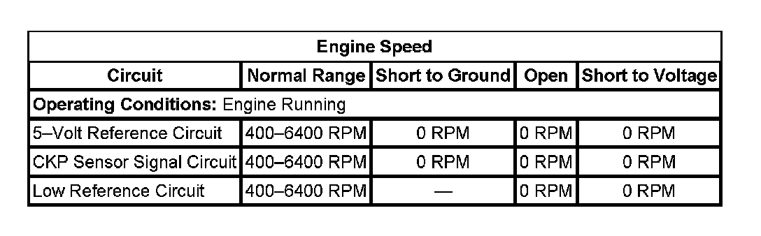 The crankshaft position (CKP) sensor circuits consist of an engine control module (ECM) supplied 5-volt reference circuit, low reference circuit and an output signal circuit. The CKP sensor is an internally magnetic biased digital output integrated circuit sensing device. The sensor detects magnetic flux changes of the teeth and slots of a 58-tooth reluctor wheel on the crankshaft. Each tooth on the reluctor wheel is spaced at 60-tooth spacing, with 2 missing teeth for the reference gap. The CKP sensor produces an ON/OFF DC voltage of varying frequency, with 58 output pulses per crankshaft revolution. The frequency of the CKP sensor output depends on the velocity of the crankshaft. The CKP sensor sends a digital signal, which represents an image of the crankshaft reluctor wheel, to the ECM as each tooth on the wheel rotates past the CKP sensor. The ECM uses each CKP signal pulse to determine crankshaft speed and decodes the crankshaft reluctor wheel reference gap to identify crankshaft position. This information is then used to determine the optimum ignition and injection points of the engine. The ECM also uses CKP sensor output information to determine the camshaft relative position to the crankshaft, to control camshaft phasing, and to detect cylinder misfire.