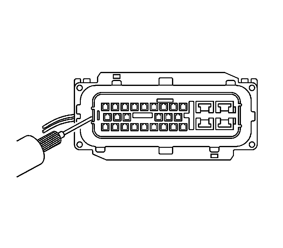 8. Insert the J-38125-553 (15315247) tool into the entry canal and pry up on the terminal retainer. The terminal retainer is a small plastic piece on the top of the terminal. The terminal retainer must be held up while the terminal is pulled out of the connector.