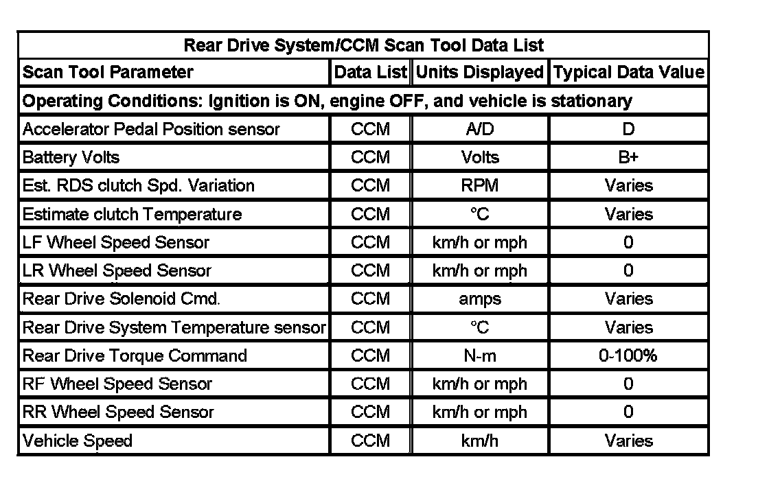 The rear differential clutch control module (CCM) Scan Tool Data Lists contain all the clutch control module system related parameters that are available on the scan tool. The parameters in the list are arranged in alphabetical order. The column, "Data List," indicates the location of the parameter within the scan tool menu selections.