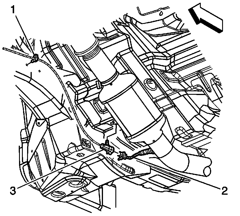 41. Install the HO2S 2 wiring harness retainers (1, 3) to the vehicle underbody.