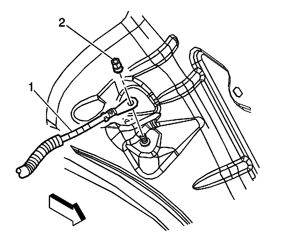 3. Remove the negative battery cable nut (2) from the inner fender body ground stud.