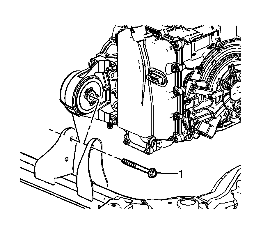12. Remove the front transmission mount thru bolt (1).