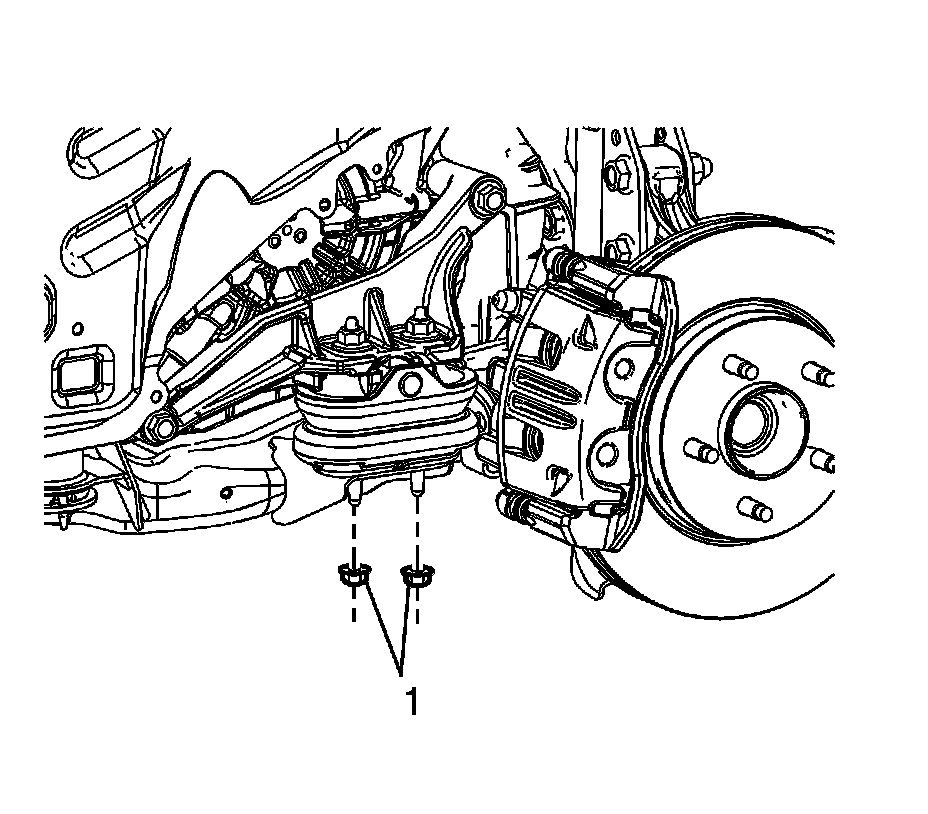 11. Remove the power steering gear mounting bolts (1) and secure the gear out of the way using mechanics wire or equivalent. Refer to Steering Gear Replacement (Electronic Power Steering) (Service and Repair)Steering Gear Replacement (Hydraulic Power Steering) (Service and Repair).