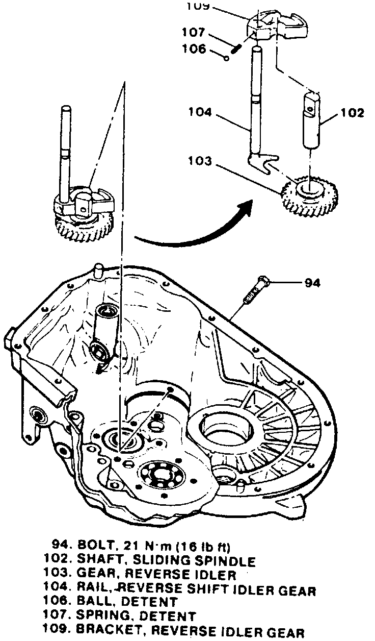 2. Remove shift rail (104), gear (103), shaft (102) and bracket (109).