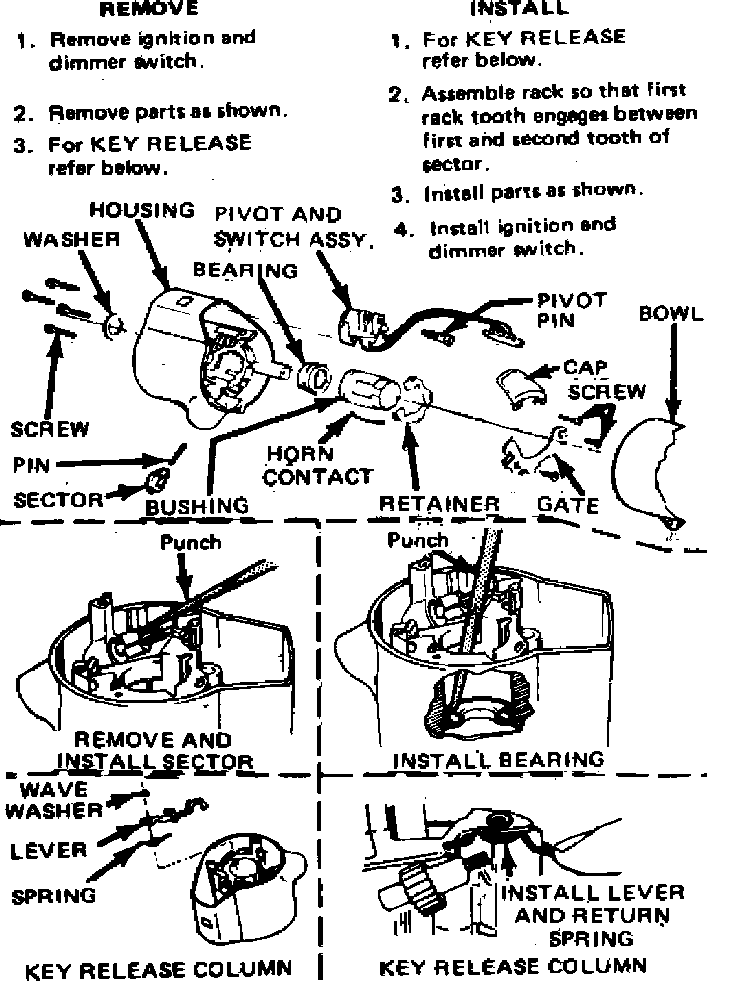 1. Remove turn signal switch as outlined under ``Turn Signal Switch, Replace'' procedure.