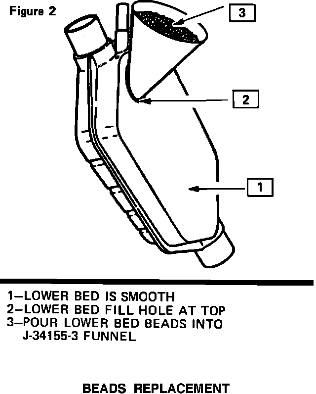 9. Using funnel J-34155-3, pour the sifted beads into the lower bed of the new converter (see Figure 2). Tap belt flange with rubber mallet to allow beads to settle. Continue filling and tapping until converter is full. If additional beads are required to completely fill the lower bed, it will be necessary to obtain a lower bed bead kit from the parts department.
