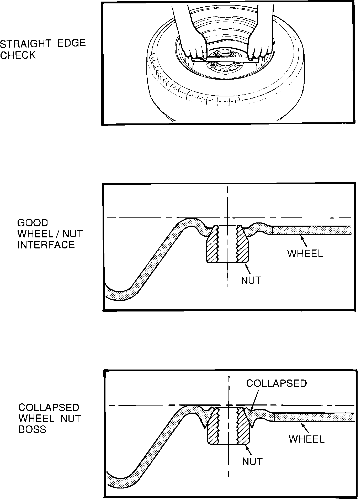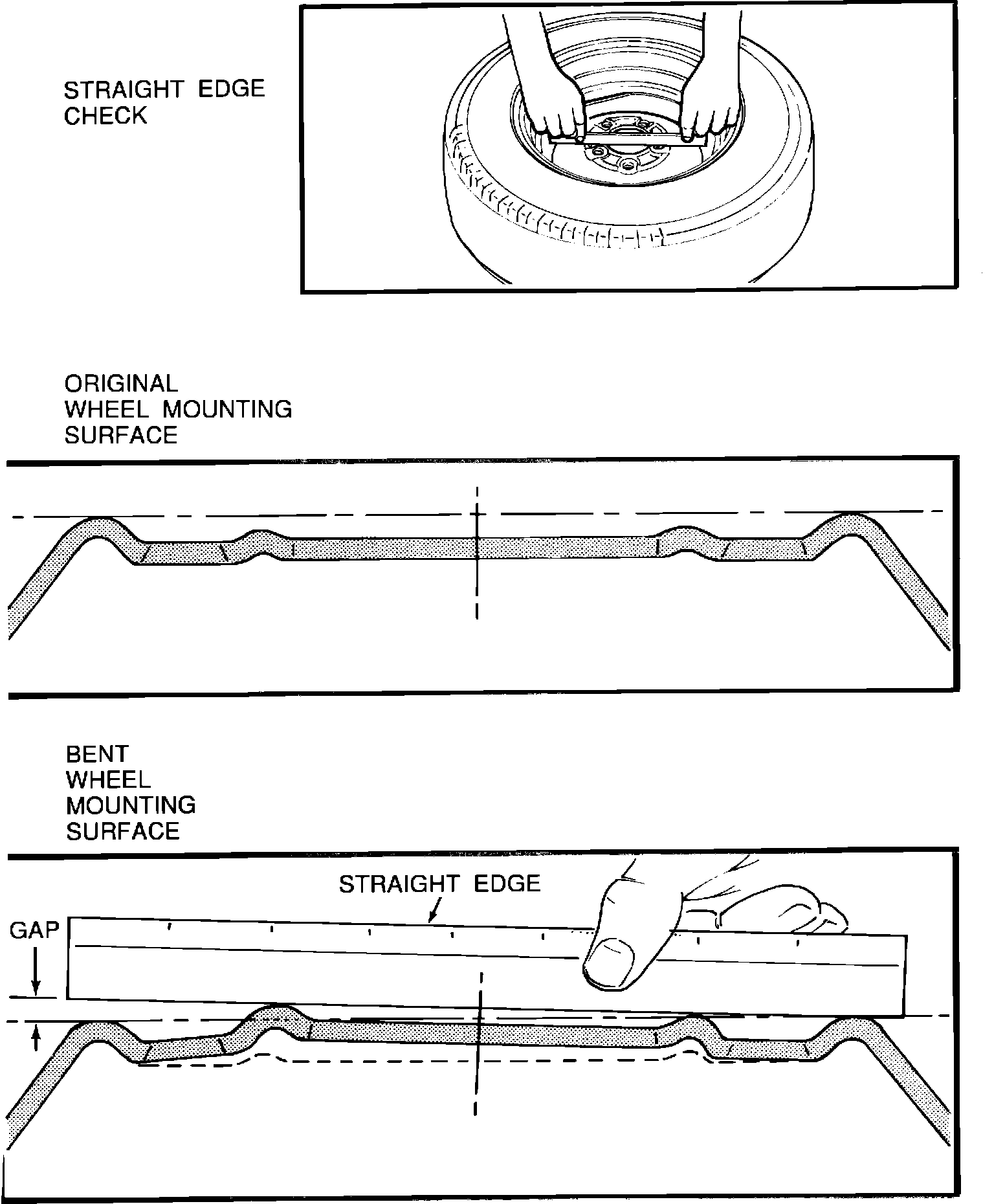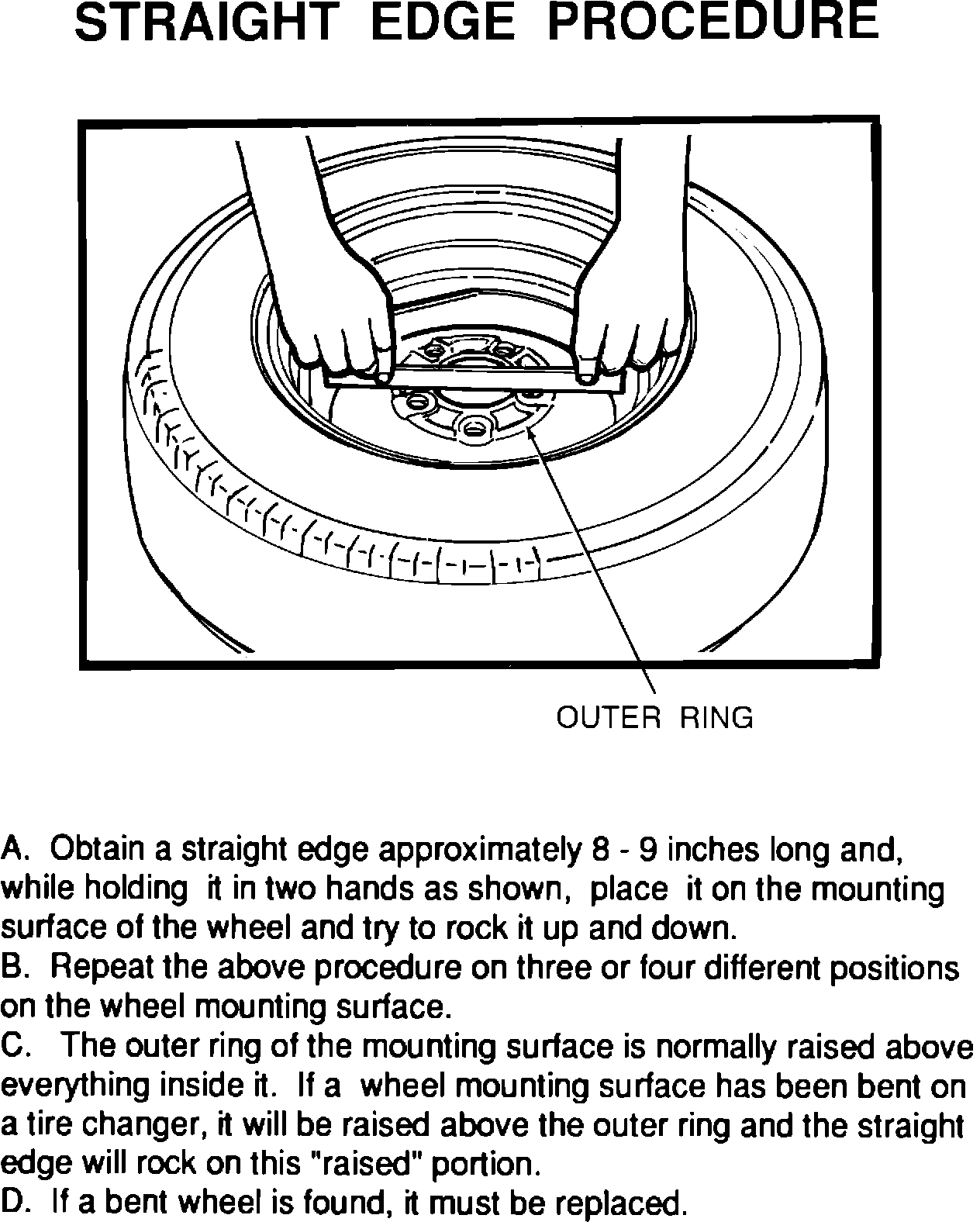 A. Obtain a straight edge approximately 8-9 inches long and, while holding it in two hands, as shown in the illustration, place it on the inboard mounting surface of the wheel and try to rock it up and down.