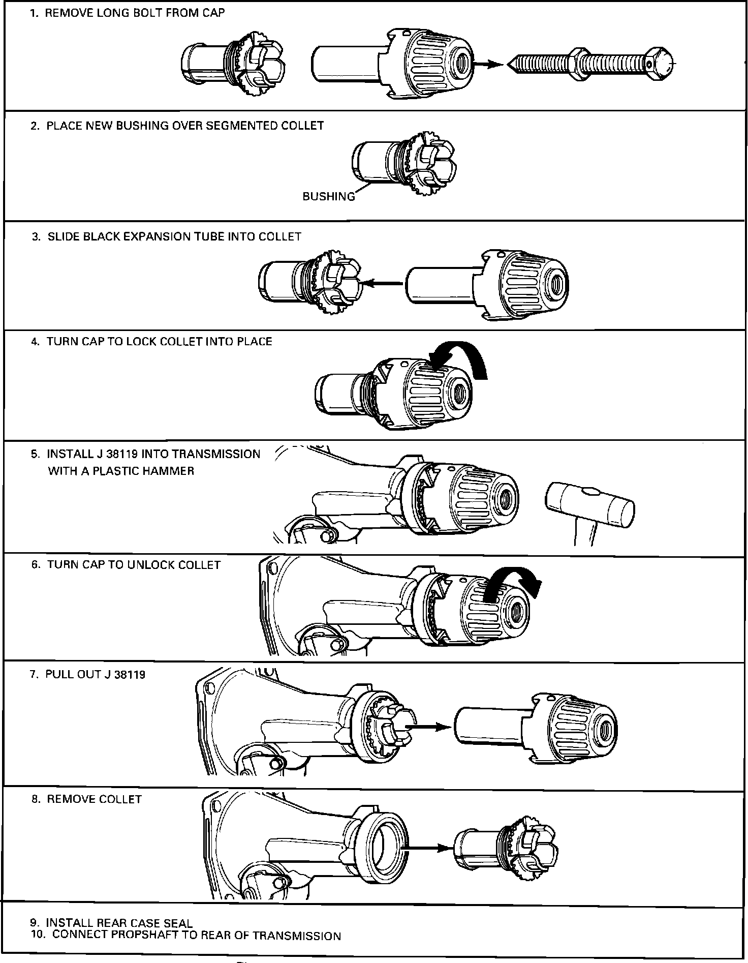 5. Install new bushing into transmission by driving J 38119 in firmly with a plastic hammer.