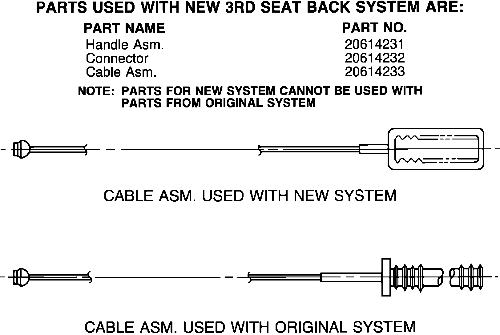 When repairing vehicles with this condition, new improved parts are available from WDDGM.. The new parts that make up the seat back release system can not be used with parts from the original system. Therefore when required, parts from the original system must be completely replaced with new parts. To determine if a system is of the new type, inspect the end of the cable assembly that attaches to the new release handle. A cable that is part of the new system will have an opening that engages the release handle. See illustration.