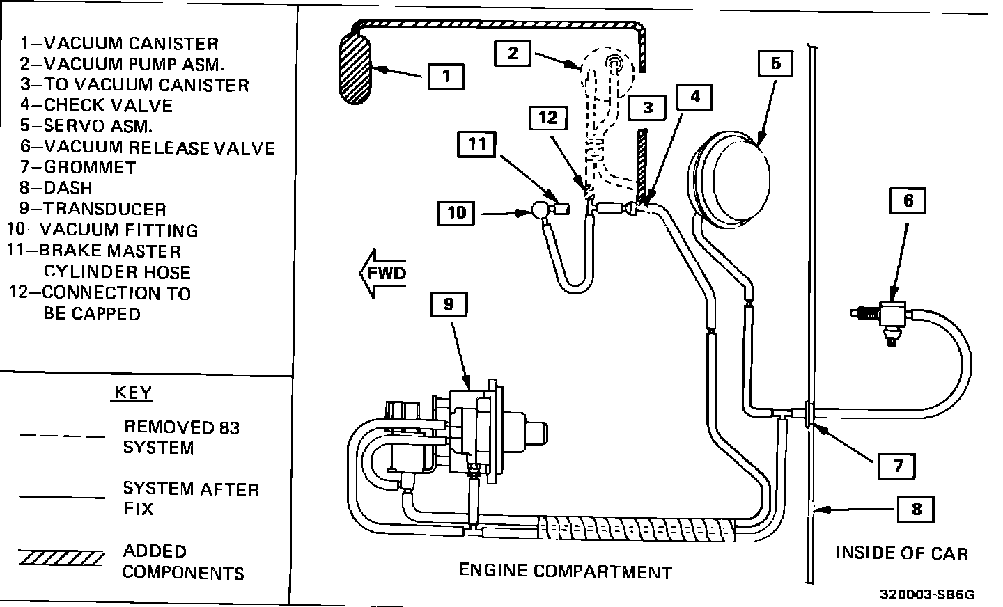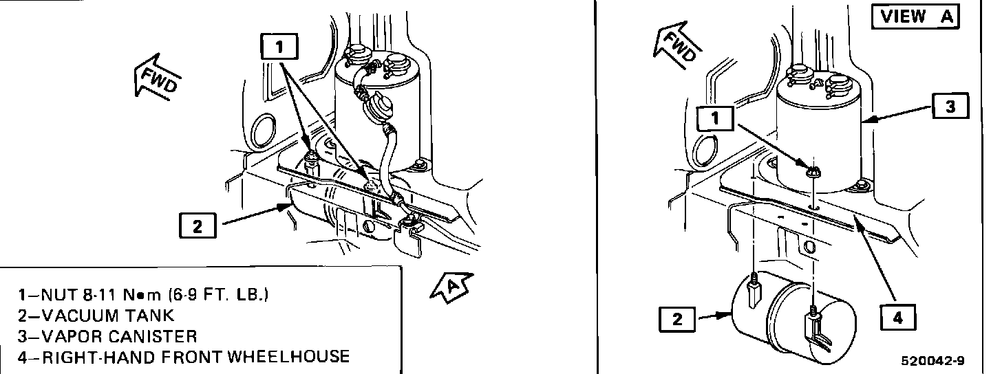To correct the condition remove the vacuum pump and install cover, Part Number 10022599, and gasket, Part Number 9776705, using the existing bolts and washers.. A vacuum canister, Part Number 14080255, must be installed using nuts, Part Number 11503747. The vacuum canister is installed below the vapor canister as shown in Figure 2. Six feet of 1/4" vacuum hose, one foot of 1/8" vacuum hose and 1/4"-1/8" reducer are required to connect the canister. The canister should be connected as shown in Figure 1. Verify operation of cruise control unit.