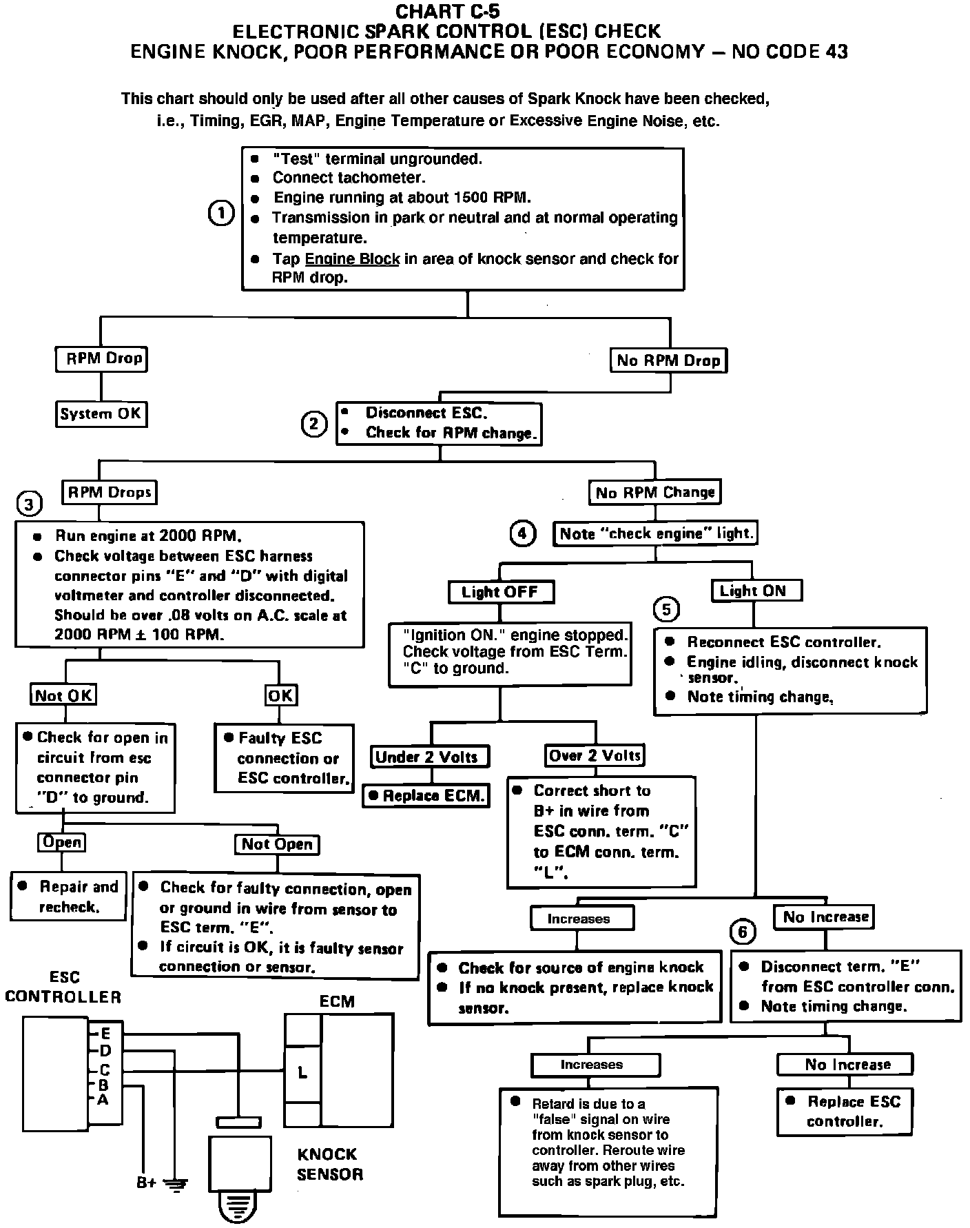 4. Check engine light should be "on" and a Code 43 set because ESC system would be retarded too long. If no light comes on, the ECM is not retarding the spark because of a voltage on the circuit to terminal "L" or the ECM is faulty.