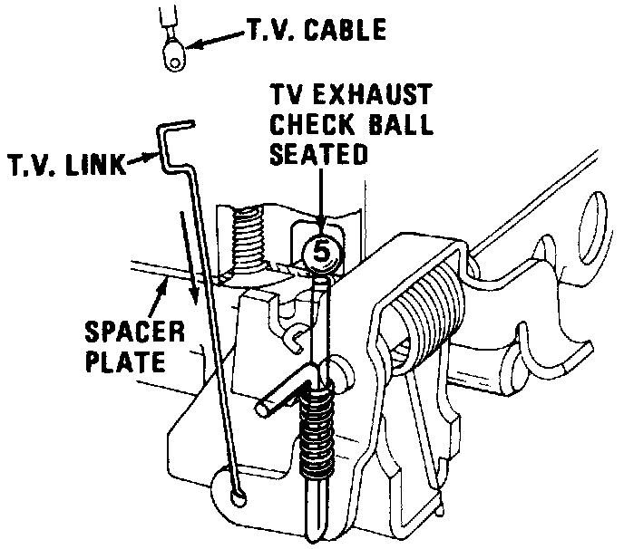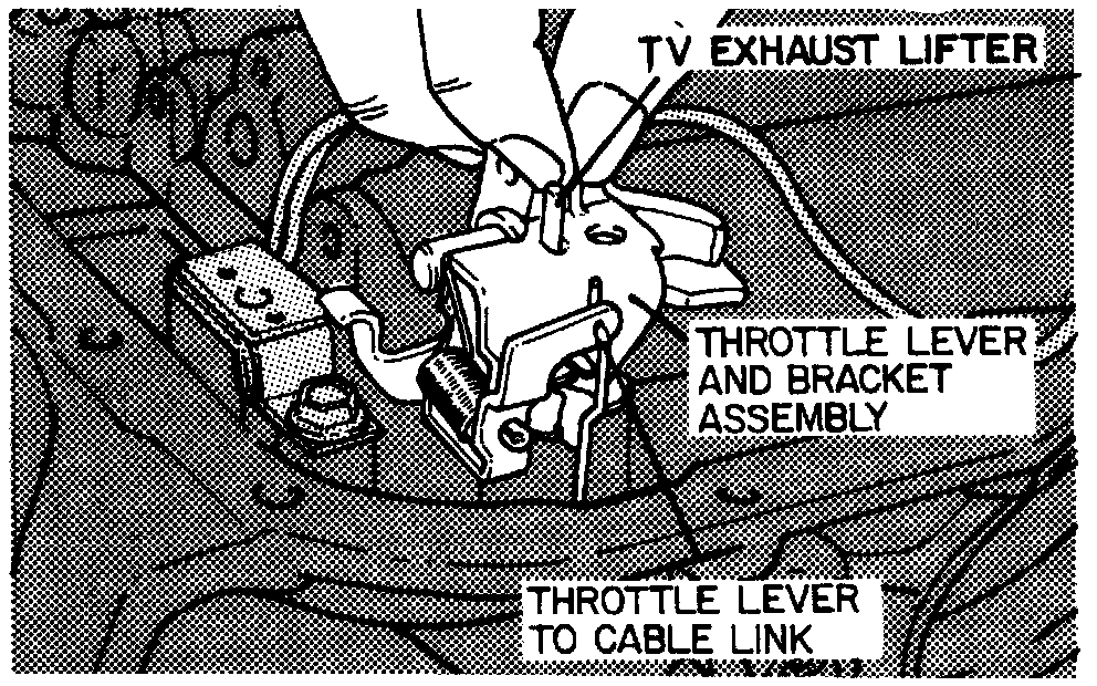 22. Install throttle lever and bracket assembly, positioning slot into bracket with roll pin. Align lifter through valve body and link through T.V. linkage case bore and secure with bolt.