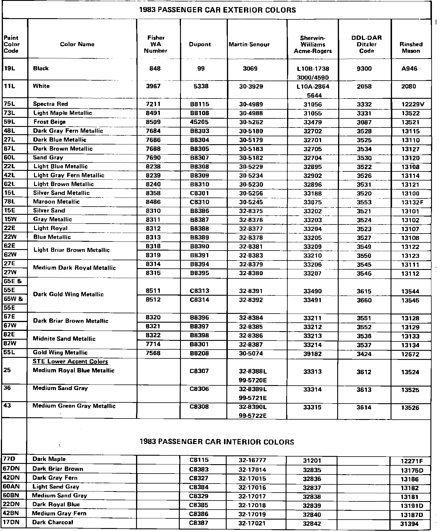 The table (shown on the reverse side) reflects the Pontiac exterior and interior paint colors and stock codes released for the 1983 model year. It is recommended that the paint color code be obtained from body plate located in the engine compartment and paint stock codes be verified with your paint vendor due to possible color changes.