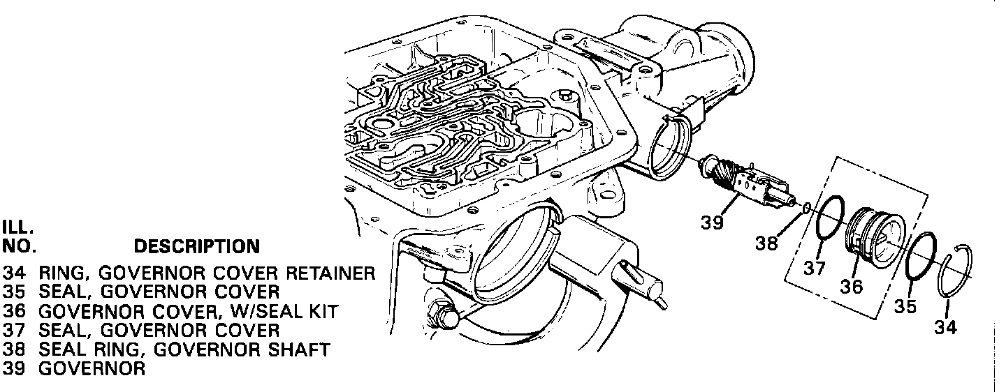 Remove the cover (on car service) and inspect the internal governor cover seal (37). If damaged or rolled, replace the entire governor assembly (36). The seal is not available separately.