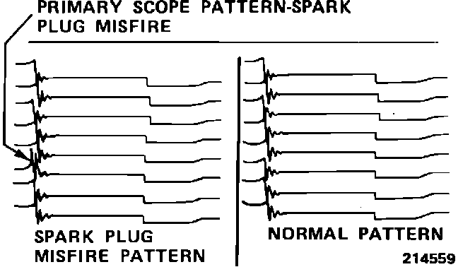 A diagnostic scope displaying the Primary pattern may also be used in diagnosing this condition. The firing line will be irregular and higher, and the oscillations from the primary field collapsing will be distorted when a secondary circuit malfunction exists (refer to illustration).