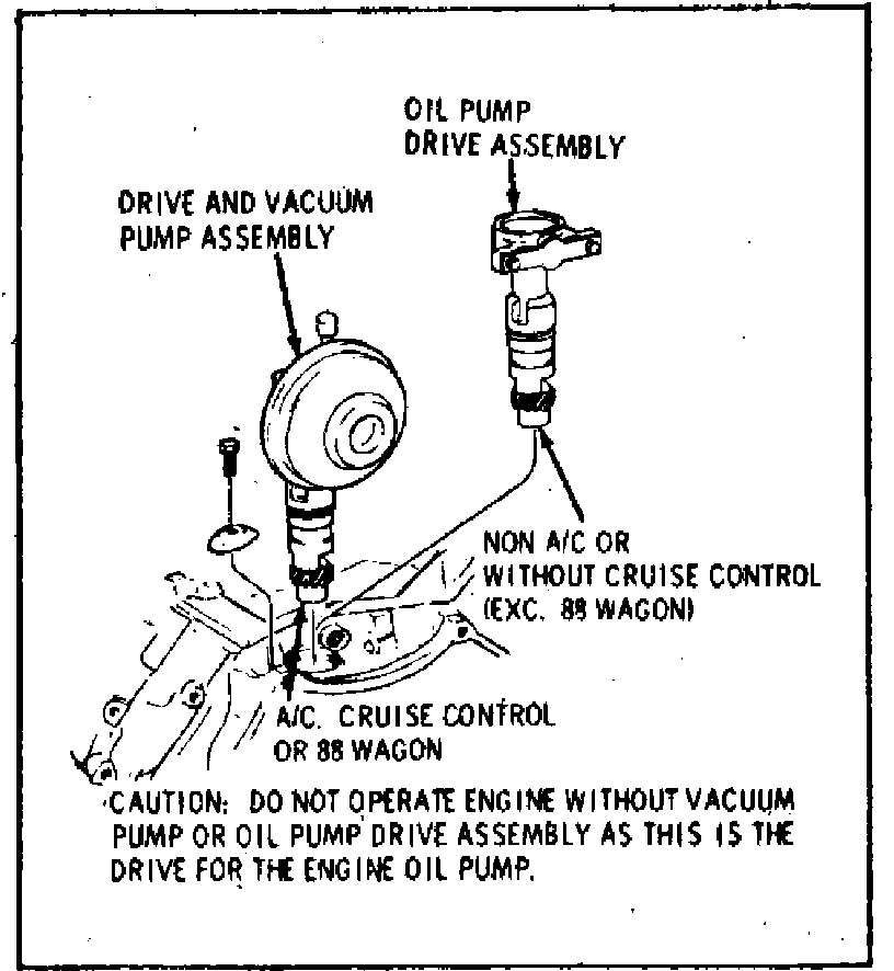 13. Disconnect vacuum lines at vacuum pump. Remove vacuum pump, if equipped with A/C, or oil pump drive assembly, if less A/C, Fig. 7.