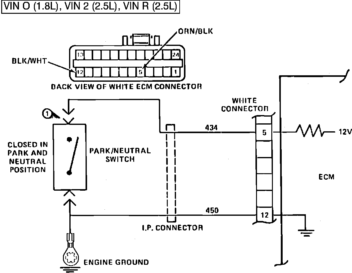 The Park/Neutral Switch is closed to ground in Park or Neutral and open in Drive ranges. The ECM supplies 12 volts through an internal resistor to CKT 434 and senses that the switch is closed when the voltage at terminal 5 drops to less than 1 volt.