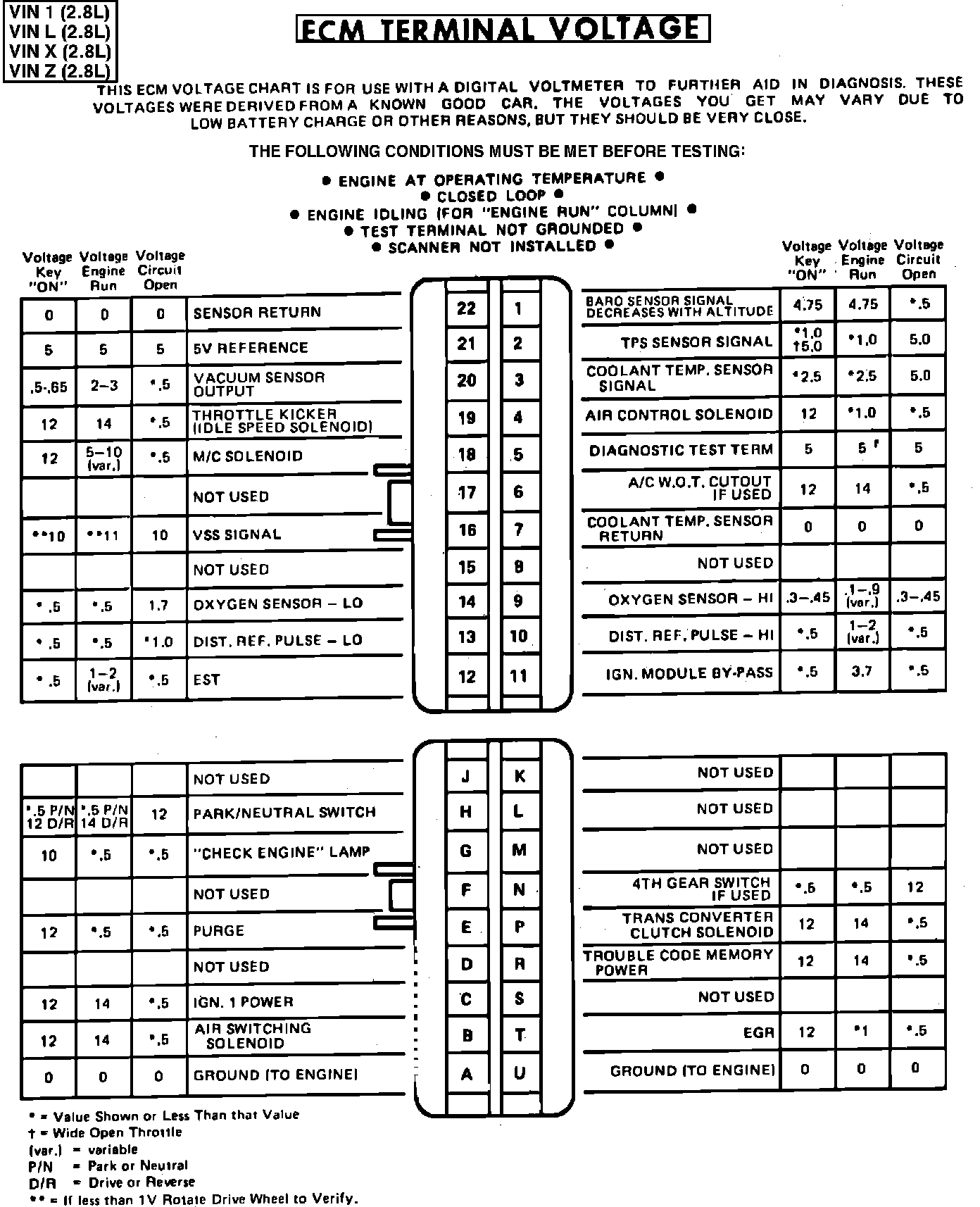 Fig. 031 - ECM Connector Terminal Identification & Voltage Specifications.:
