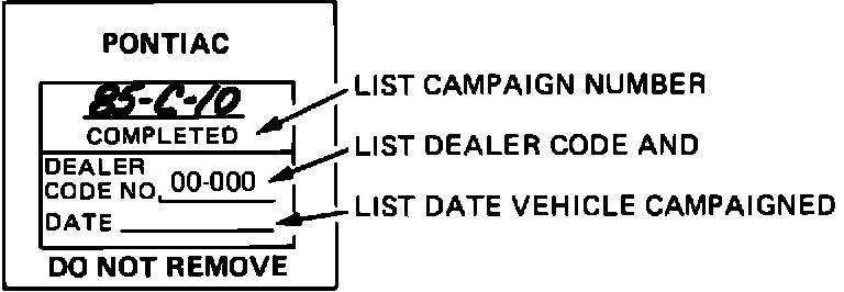 Each vehicle modified in accordance with the instructions outlined in this Product Campaign Bulletin will require a "Campaign Identification Label". Each label provides a space to include the campaign number, the five digit dealer code of the dealer performing the campaign service, and the date vehicle was campaigned. This information may be inserted with a typewriter or ball point pen. Install the label only on a clean, dry surface of the radiator baffle where it is readily visible. (Additional campaign labels are available on stationery order Form 7901-709.)