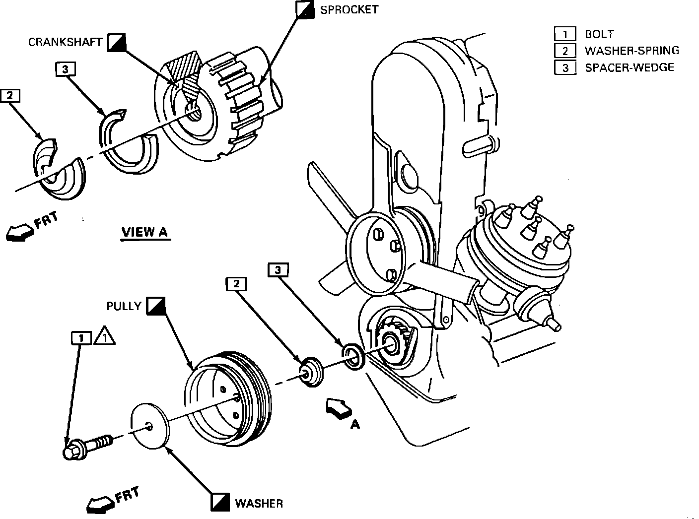 3. Remove crankshaft pulley bolt, washer and pulley.