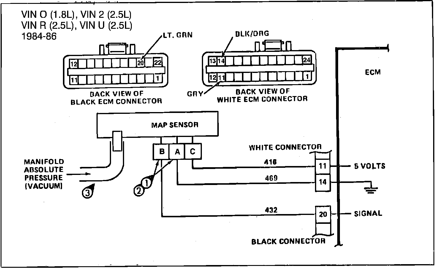 3. Check vacuum hose to sensor for leaking or restrictions. Be sure no other vacuum devices are connected to the MAP hose.