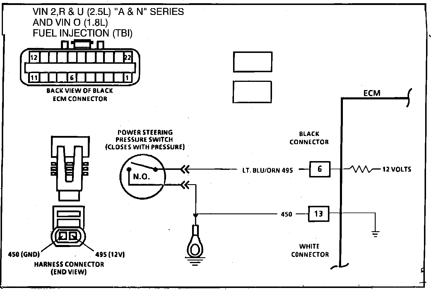The power steering pressure switch is normally open to ground, and circuit 495 will be near battery voltage.