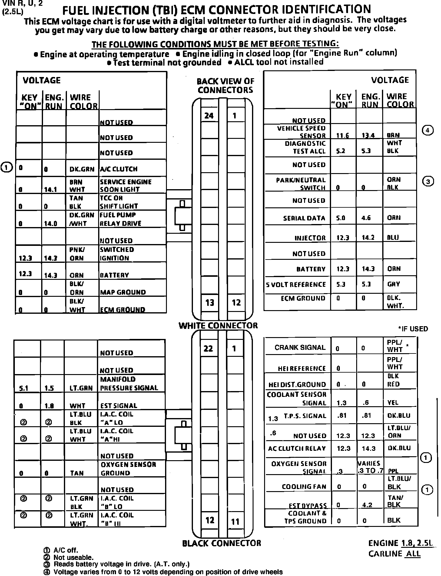 Fig. 004 ECM Connector Terminal I.D. & Volt. Specifications: