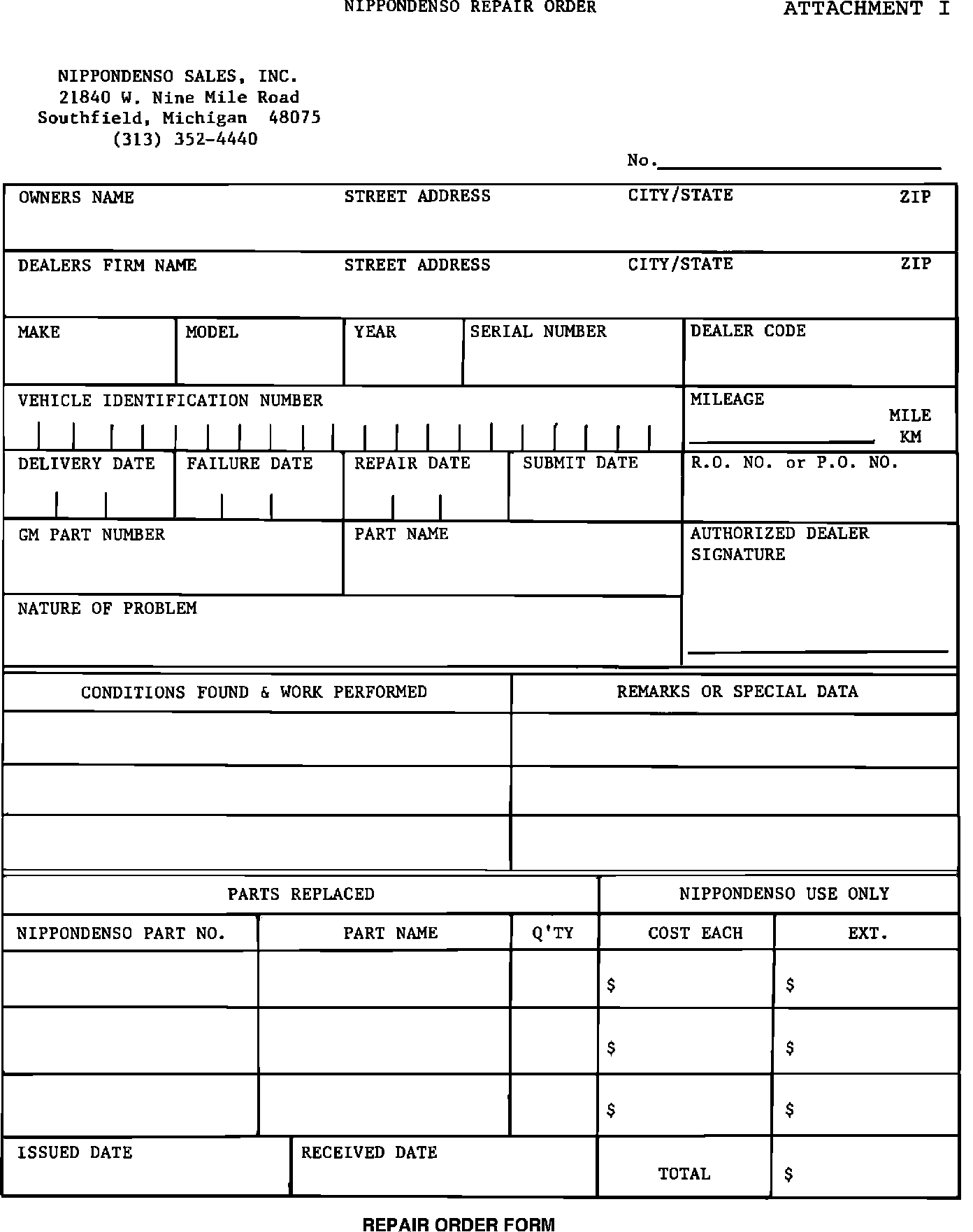 Replacement parts will be shipped postage paid via twenty-four hour delivery along with the information form (Attachment I) . A copy of the information form must be attached to the warranty repair order. Core charges will be reimbursed upon receipt of the replaced parts by Nippondenso Sales, Inc.