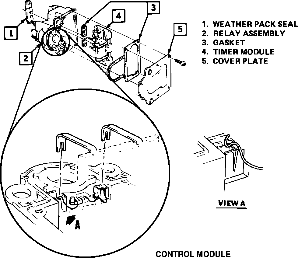 Pull the relay wires out of both clips. Scrape the end of the wires to remove the coating. Supply a ground to one end of the relay wire and then momentarily place 12 volts to the other end to make sure the relay works. (The sound and motion of the relay working is very evident.) If the relay works, position the scraped end of the wires down into the clip area as shown in view A of Figure 1 and reinstall the timer module. Solder the prongs of the timer module to the clips and the wire. Reinstall the cover and reinstall the unit on the car.