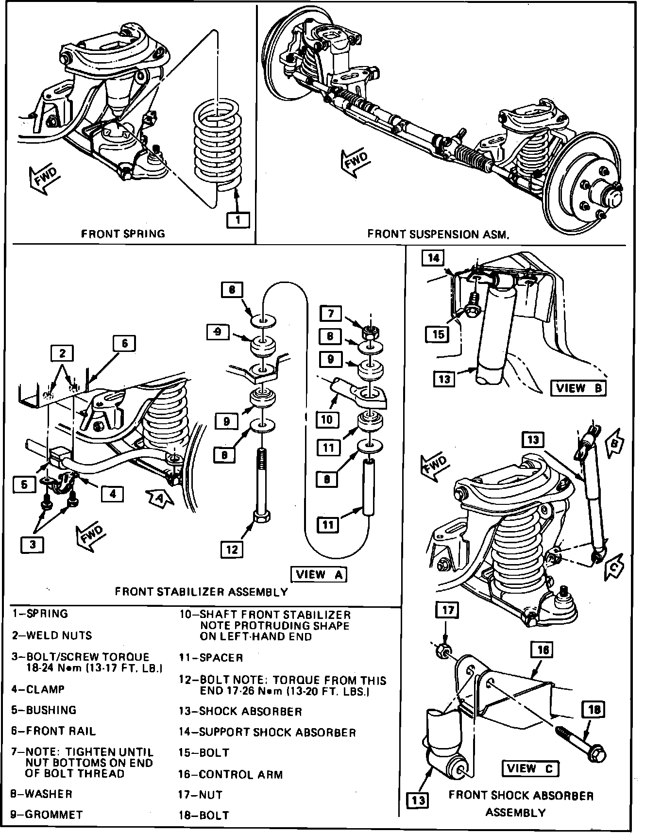 2. Remove stabilizer bar attaching bolt and nut and associated components from lower control arms, Fig. 1