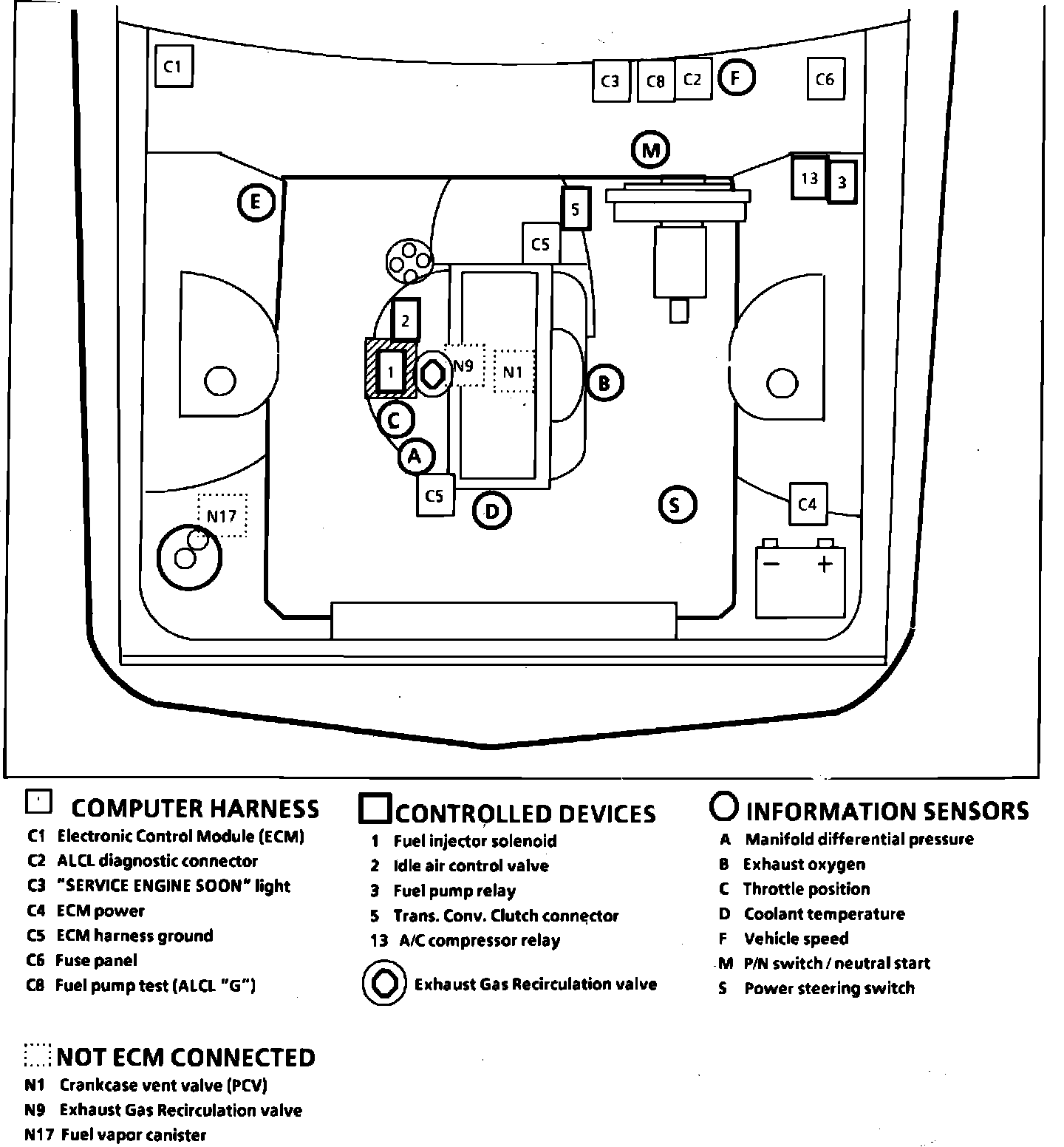 Fig. 56 Emission Component Location. 1986 W/4-151/2.5L, TBI: