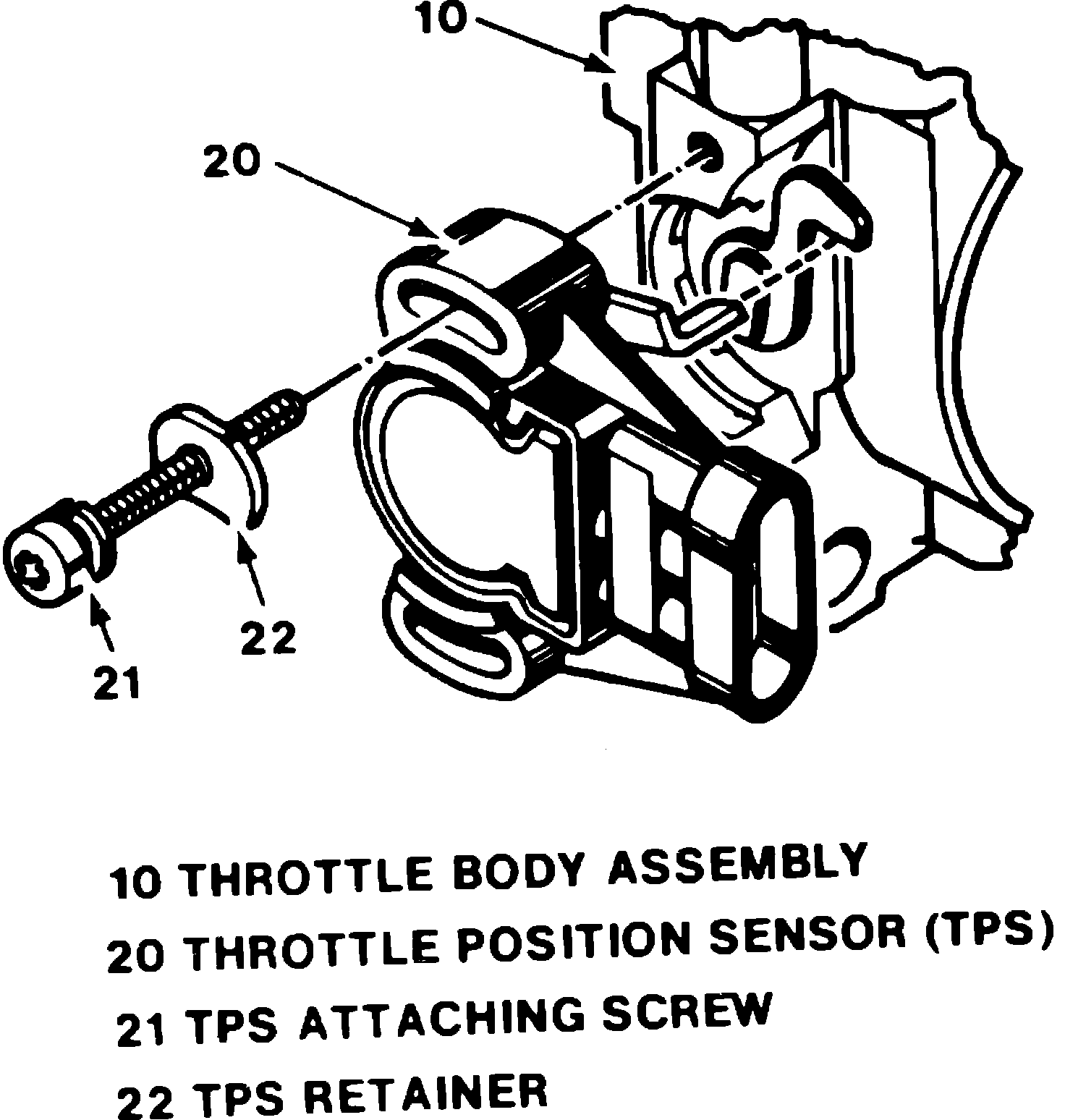 5. Apply thread locking compound 1052624 or equivalent to screw threads, then install retainers, lockwashers and screws. On 4-110 (1.8L) and 4-122 (2.0L) Turbo models, tighten screws. On all other models, adjust TPS as outlined.
