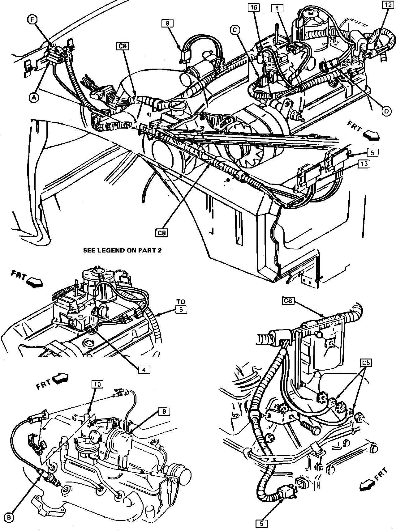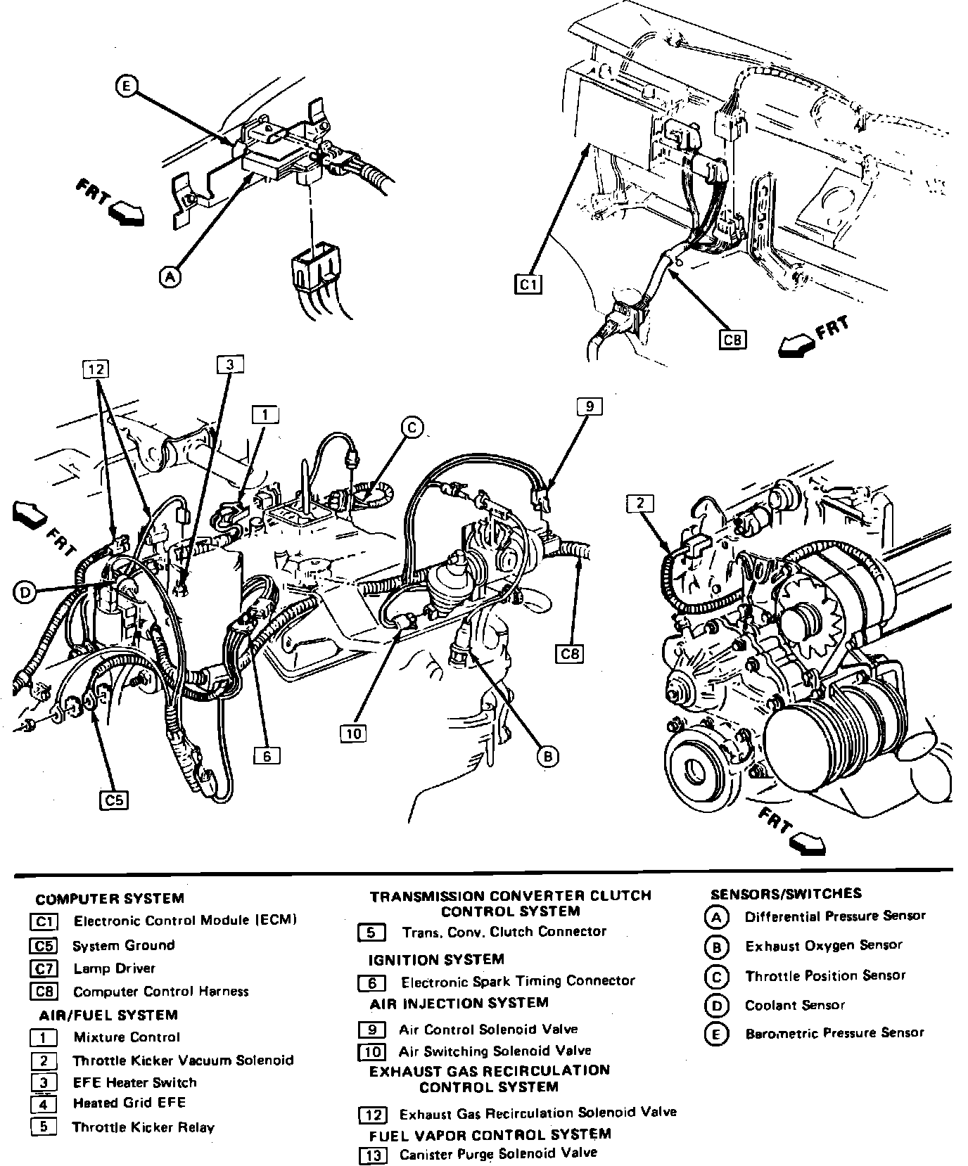 Fig. 38a Emission Component Location. 1985-86 Models W/V6-173/2.8L, 2 Bbl. (Part 1 of 2):
