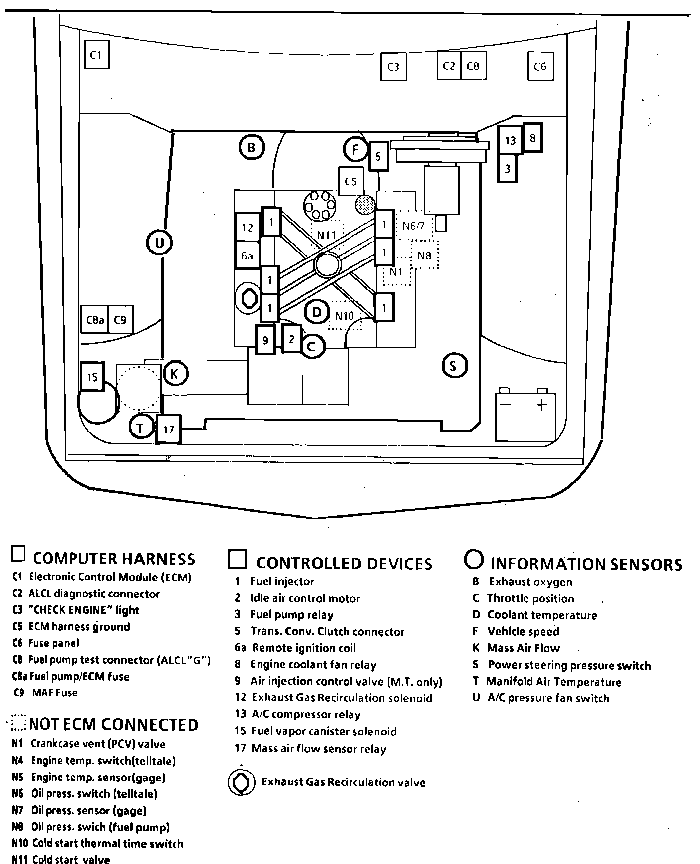 Fig. 18 Emission Component Location. 1985 Firebird W/V6-173/2.8L, PFI: