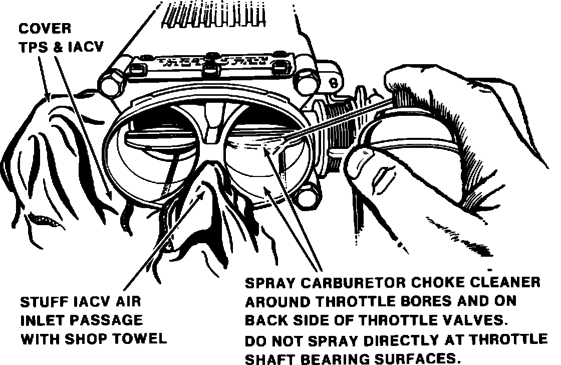 8. *Spray carburetor choke cleaner around throttle bore (s) and on back side of throttle valve(s). Avoid spraying directly at throttle shaft bearing surfaces to prevent washing out factory lubrication.