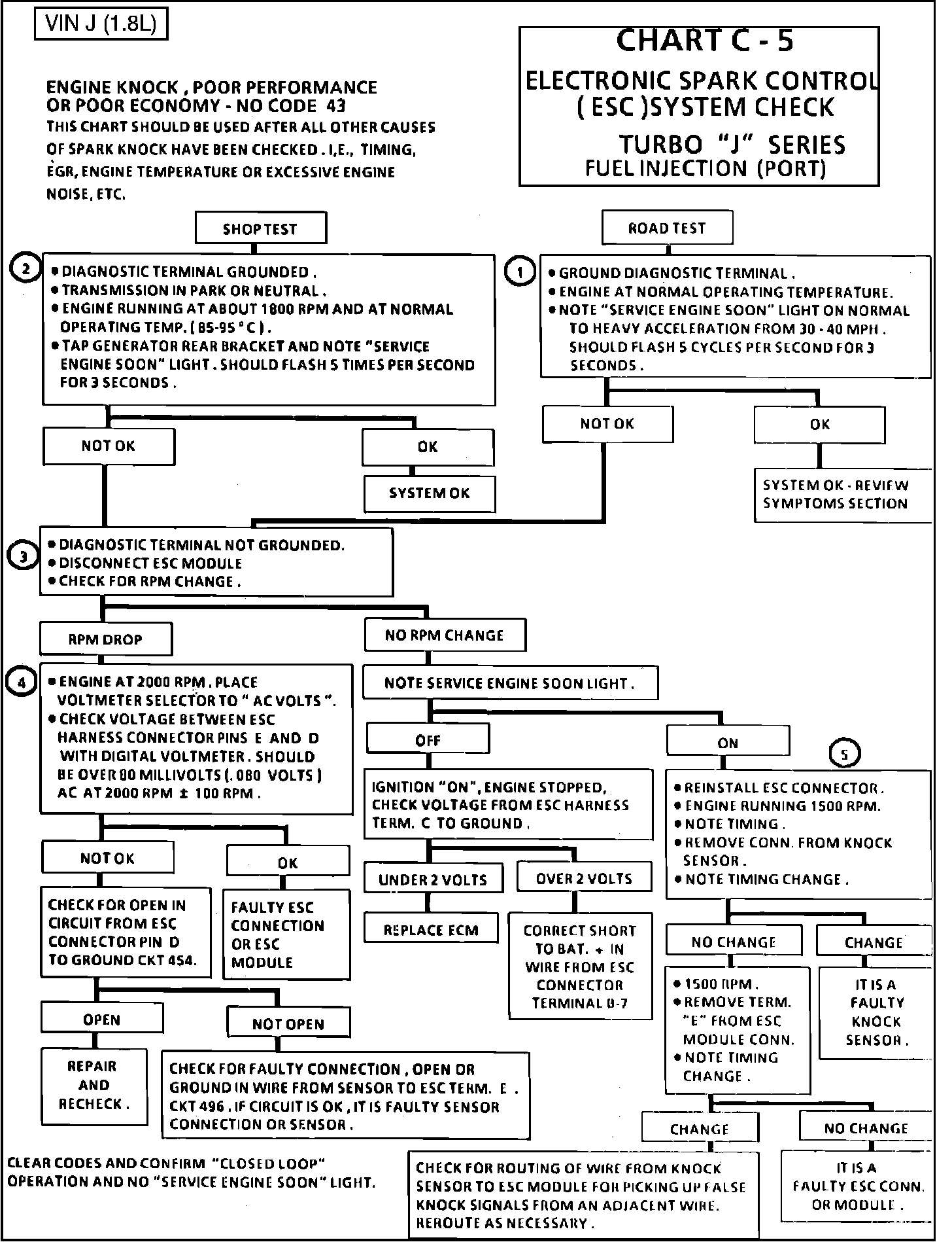 1. Road test procedure: Road test with engine at normal operating temperature, diagnostic terminal grounded and "SERVICE ENGINE SOON" light flashing "Close Loop." Note "SERVICE ENGINE SOON" light on normal to heavy acceleration from 30-40 MPH (48 km/h64 km/h). If ESC is OK, the "SERVICE ENGINE SOON" light will flash 5 times per second for 3 seconds.