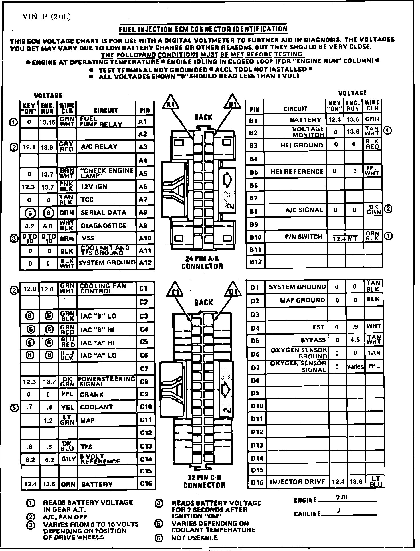 Fig. 003 ECM Connector Terminal I.D. & Volt. Specifications: