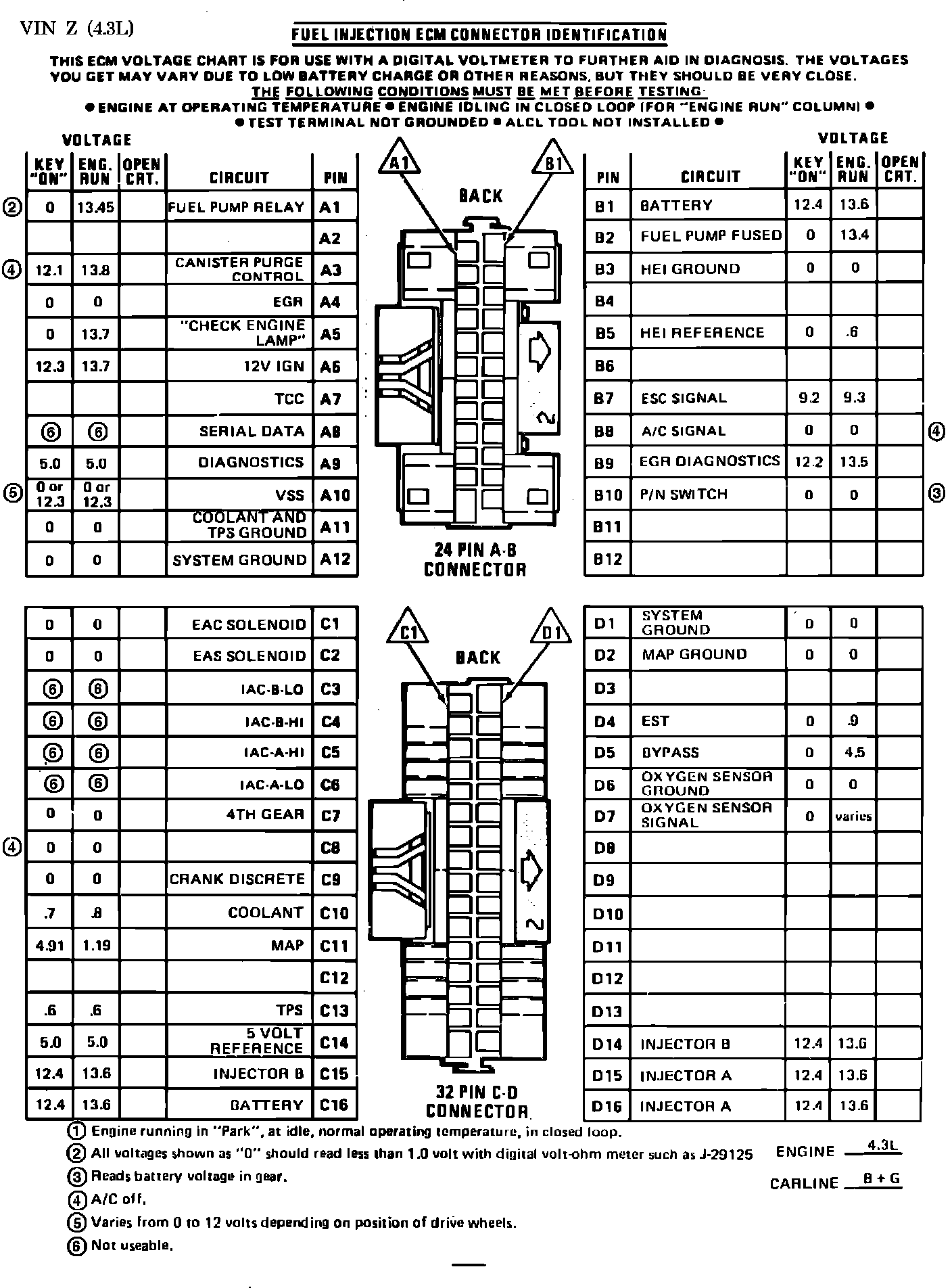 Fig. 005 ECM Connector Terminal I.D. & Volt. Specifications: