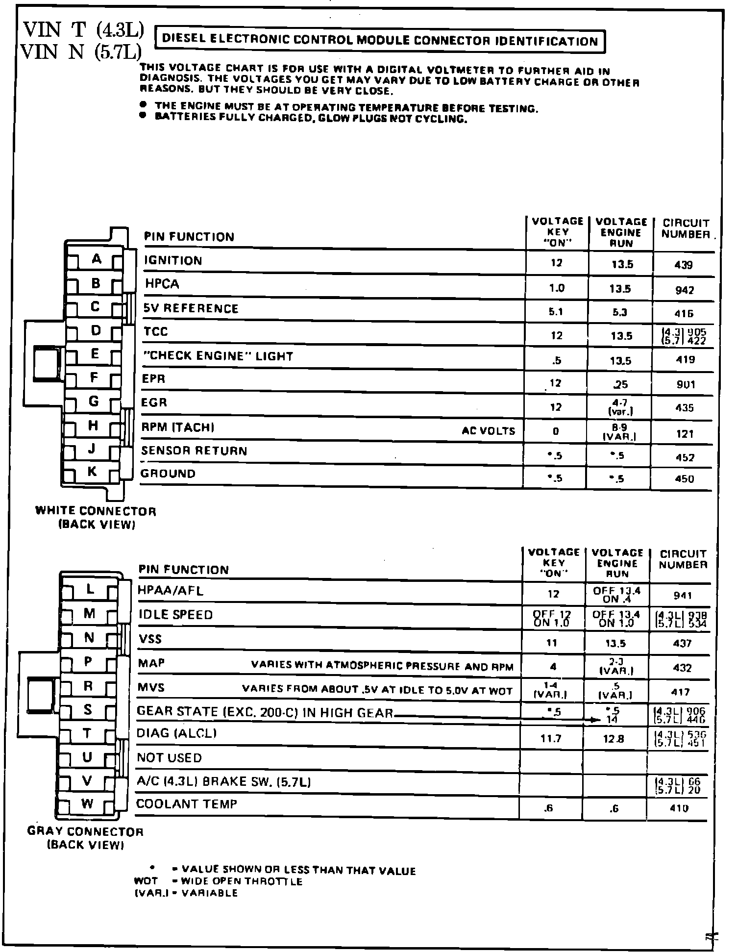 Fig. 078 - ECM Connector Terminal Identification & Voltage Specifications: