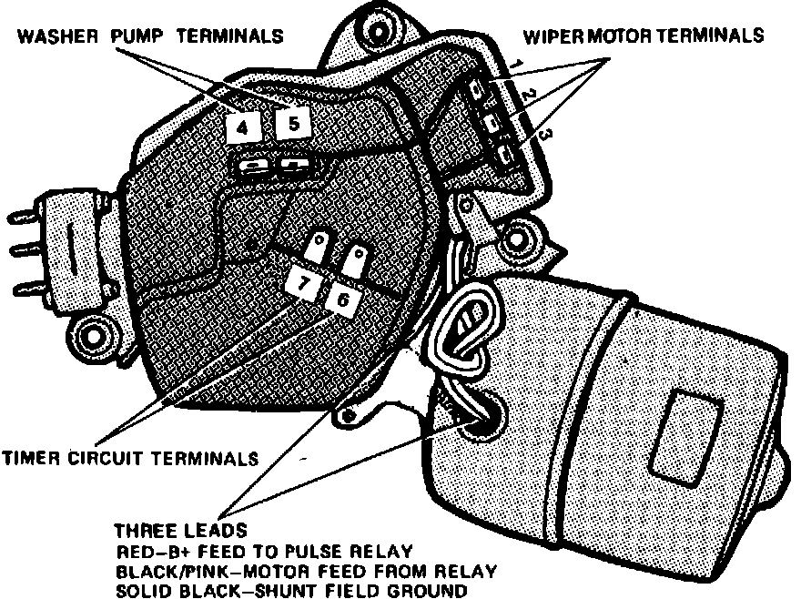 The gear box assembly contains a magnet switch, relay and terminal board assembly (gear box relay) which provides electrical connections and controls current flow through the motor. On standard (non-pulse) motors, Fig. 3, the two motor leads to the gear box relay are concealed and routed through a cavity in the gear housing. On pulse type motors, Figs. 4 and 5, the two motor leads to the gear box relay, and the feed wire to the pulse relay are exposed. Both standard and pulse motors used on Corvette have an additional ground lead to ground the motor housing to the wiper switch.