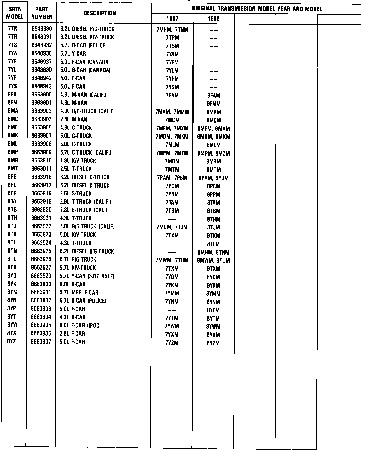 1987-1988 THM 700-R4 Srta Model Replacement Chart