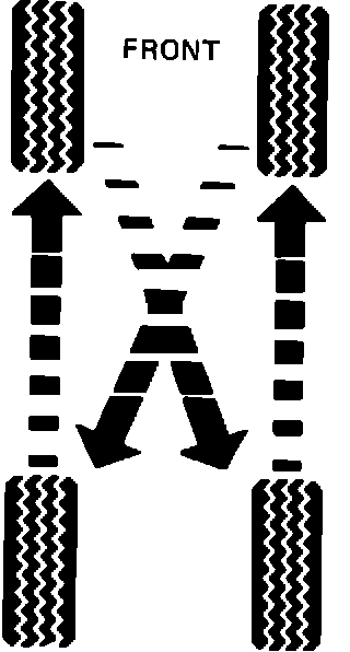 1) Rotate tires using the modified "X" pattern* shown. This allows the front tires to rotate in the opposite direction on the rear of the vehicle which will tend to even out any irregular wear quicker. It also allows all four tires to eventually run on all four positions. Tire noise may continue after rotation, but should gradually lessen after a few thousand miles.